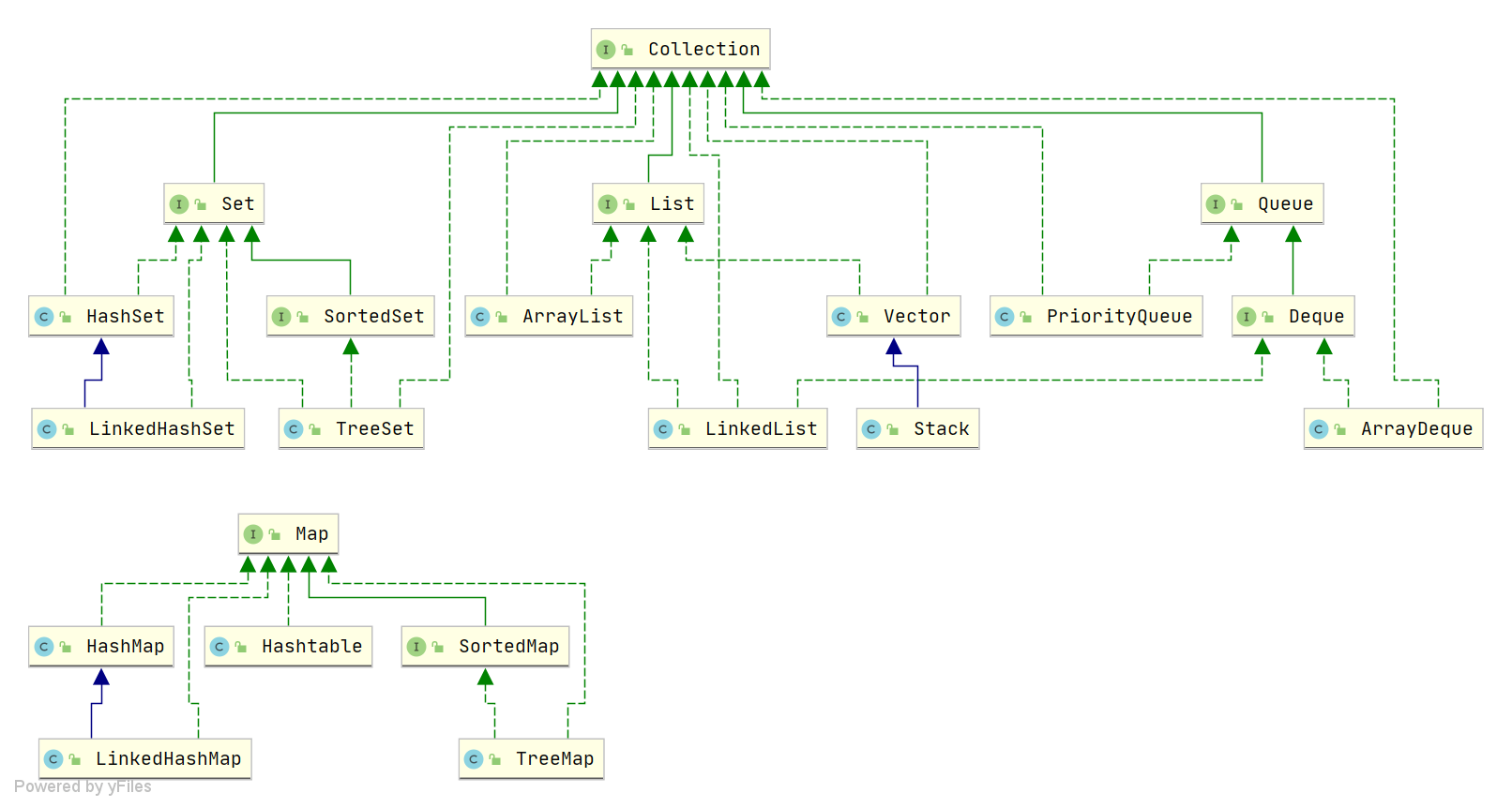 Java 集合,也叫作容器,主要是由两大接口派生而来:一个是 Collection接口,主要用于存放单一元素;另一个是 Map 接口,主要用于存放键值对。对于Collection 接口,下面又有三个主要的子接口:List、Set 、Queue。