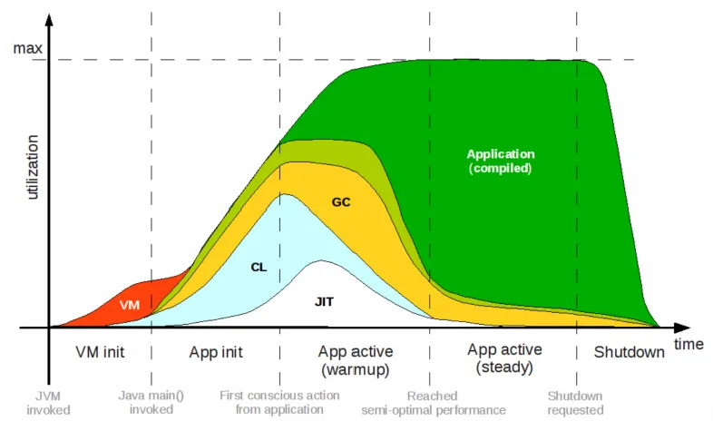 一个 Java 应用启动过程首先需要加载该应用程序对应的 JVM 虚拟机软件程序到内存中。然后 JVM 虚拟机再加载对应的应用程序到内存中。在类加载过程中,应用程序就会开始被解释执行。解释执行过程 JVM 对垃圾对象进行回收。随着程序的运行的深入,JVM 会采用及时编译(Just In Time,JIT)技术对执行频率较高的代码进行编译优化,以便提升应用程序运行速度。从启动到达到被JIT动态编译优化会经过VM init,App init 和 App active 几个阶段,相比于其他一些编译型语言,其冷启动问题比较严重。