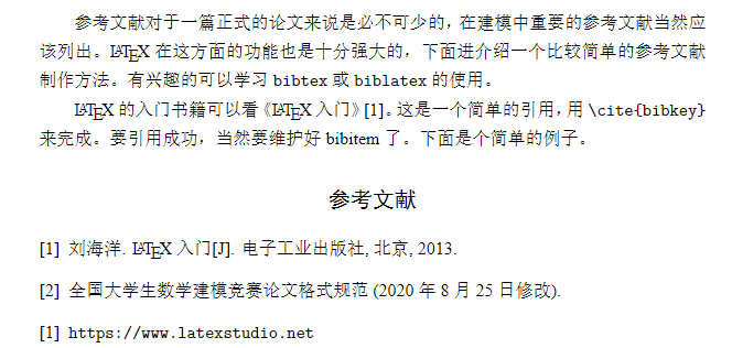 参考文献对于一篇正式的论文来说是必不可少的,在建模中重要的参考文献当然应该列出。\LaTeX{}在这方面的功能也是十分强大的,下面进介绍一个比较简单的参考文献制作方法。有兴趣的可以学习 \verb|bibtex| 或 \verb|biblatex| 的使用。