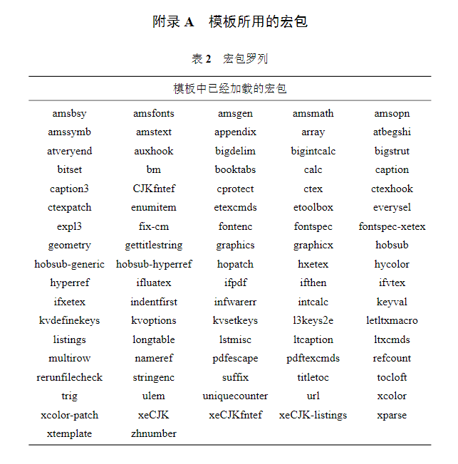 \multicolumn{5}{c}{模板中已经加载的宏包} \\